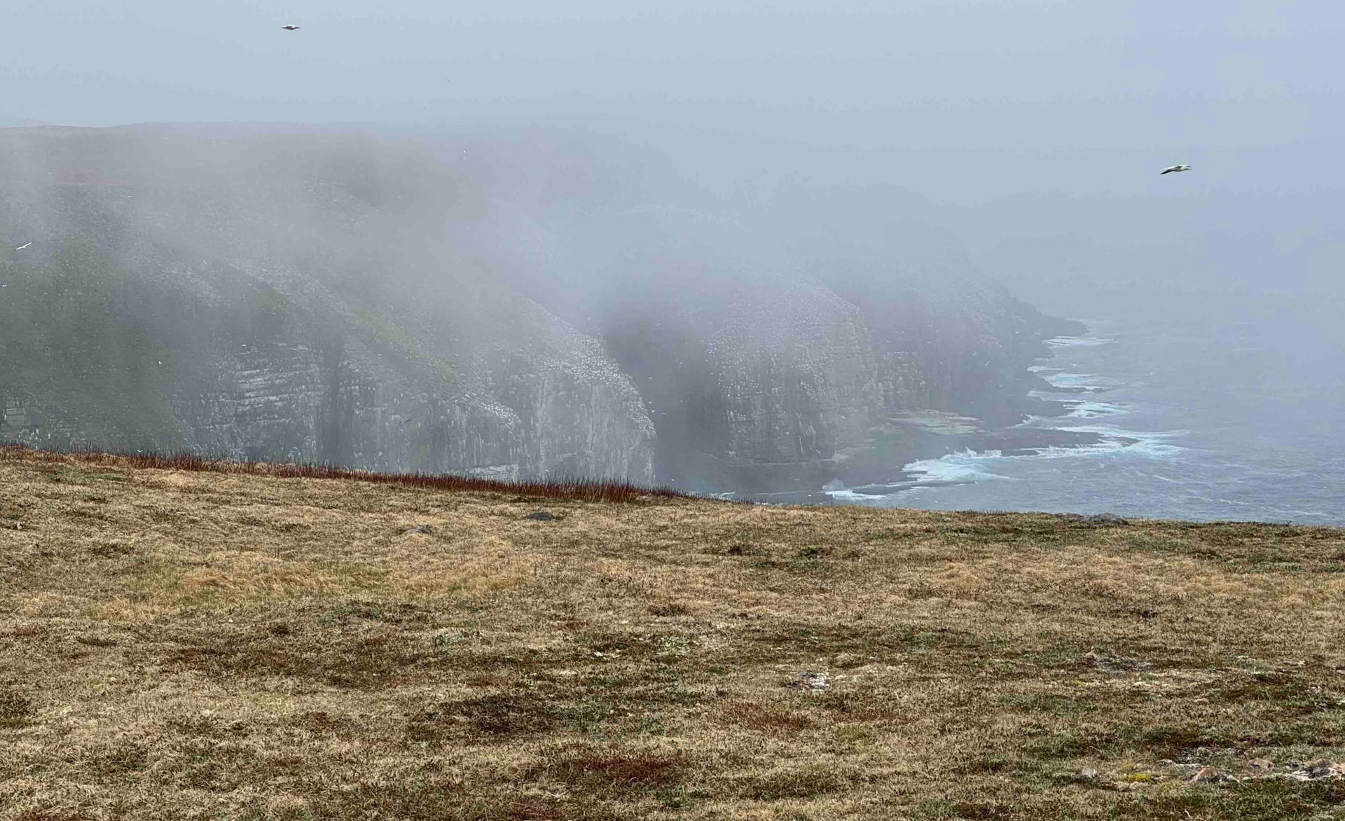 Der Plan war, nach „Cape St. Mary’s Ecological Reserve“ zu fahren, weil dort in einer Art Tierasyl, aber auch frei lebend Unmengen an Vögeln, insbesondere Puffins zu sehen sein sollen. Doch leider hat uns das Wetter einen verdammt dicken Strich da durch gemacht. Es fing schon 15 km vorher an zu nieseln. Dann wurde es orkanartig windig und als wir uns die ersten 100 m bis zum (natürlich noch geschlossenen!) Visitor Center vorgearbeitet hatten, begann der Wind das Meer derartig aufzupeitschen dass die Gischt teilweise als Nebel über die Klippen zog und jedwede Sicht hinter einem feuchten Vorhang verbarg.