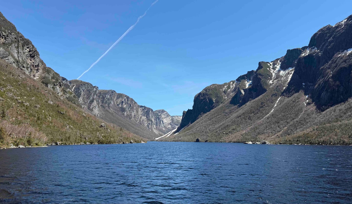 Für heute war die Bootstour auf dem Binnenfjord von Western Brook Pond geplant. Gestern Abend online gebucht, (fast) problemlos, wenn man dann mal deren Website verstanden hat und auf der Seite des Bezahlanbieters gelandet ist; der versteht sein Geschäft! Also sind wir heute morgen gegen neun aus den Federn, waren um zehn beim Frühstück (im selben Lokal wie gestern Abend, nur das heute Morgen leider die „unpolite shift“ dran war. Für einen zweiten Kaffee musste ich tatsächlich am Tresen danach fragen… Egal, da kommen wir eh nicht mehr her! Dann flinken Schrittes zum Auto und die knapp 30 Kilometer zum Parkplatz der Attraktion gefahren. Nun noch die drei Kilometer zu Fuß durch die Landschaft, bis das Hemd wieder nass war, um dann immerhin ohne ID-Check oder Buchungsnummernkontrolle (wie auch ohne WIFI oder Mobilfunk in der heutigen Zeit?) unsere Bordkarten zu erhalten. Der Dampfer war proppenvoll, schließlich boten sie heute nur eine einzige Fahrt an. Da wollte ein jeder mit, der noch nie von einem Boot aus einen Hügel gesehen hat. Ja, denn das war es dann auch ungefähr. Zwei oder drei kleine Wasserfällchen kamen da noch die Steinplatten heruntergeorgelt, was vom Skipper mit frenetischem Jubel begleitet und auch vom Großteil der Teilnehmer angemessen gefeiert wurde.