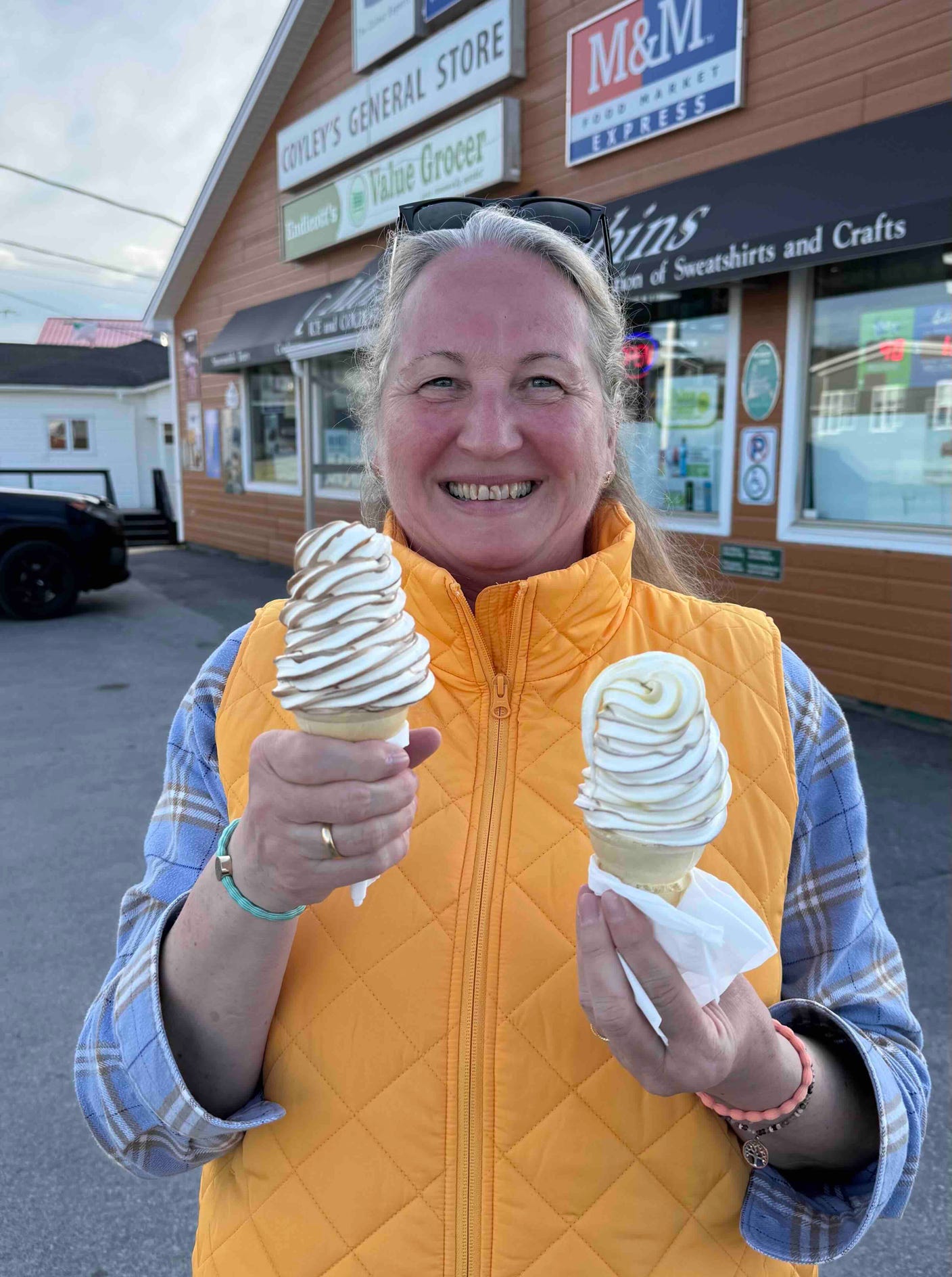 Danach haben wir noch den ortsansässigen Großhändler für einfach alles gestürmt. „Grocery, Craftsmen’s need … und sonst auch noch alles“. Dort gab es aber – und das ist wahrhaft heroisch zu nennen: SOFTEIS! Und zwar in so ziemlich allen Geschmacksrichtungen dieser Erde. Bei 7°C Außentemperatur Softeis schlecken. Vanile-Schok & Pina Colada-Blaubeere: Ein Genuss!